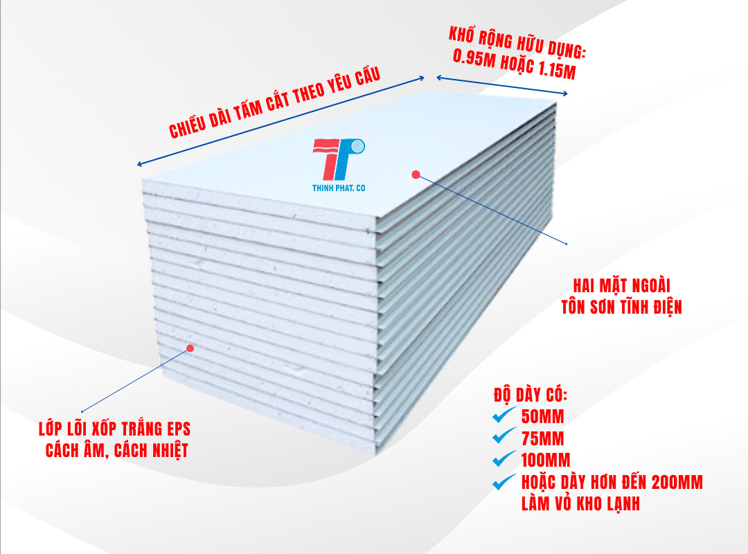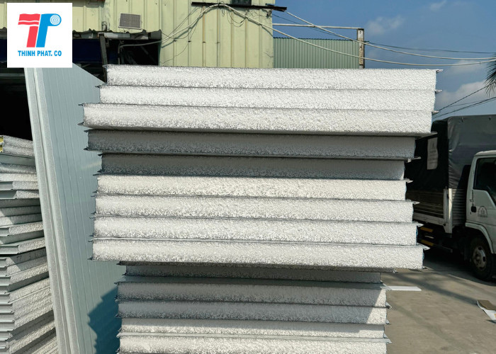 Lớp cách nhiệt: Nằm giữa hai lớp ngoài, thường làm từ vật liệu cách nhiệt như xốp EPS (Expanded Polystyrene), xốp PU (Polyurethane), hoặc bông khoáng (Rockwool).