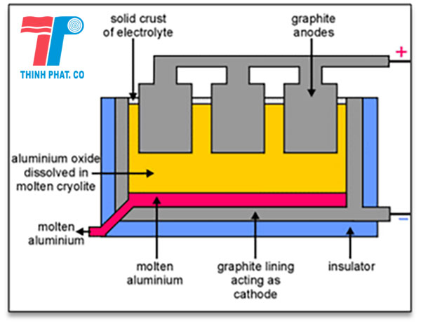 Về cơ bản nhôm phòng sạch được sản xuất ra nhờ quá trình khử điện phân. alumina thu được ở bước 1 ta đen hào tan trong bồn nấu chảy kết hợp với băng tinh thạch criolit ở 1000 độ C.