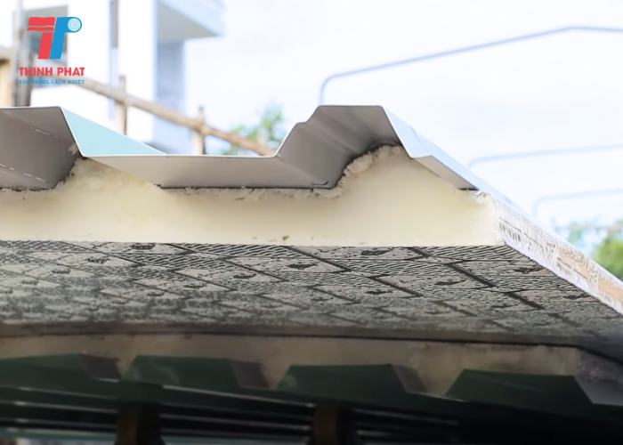 - Lớp giữa: Lõi foam PU (Polyurethane) có khả năng cách nhiệt, chống cháy, giúp giảm nhiệt độ bên trong ngôi nhà.